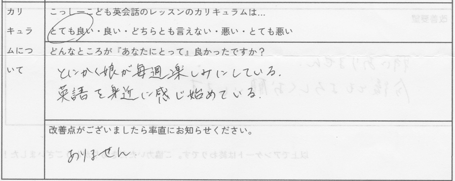 - 英語を覚える!だけでなく、毎回、楽しく前向きにレッスンに取り組める姿勢を作ってくださり、ありがとうございます。