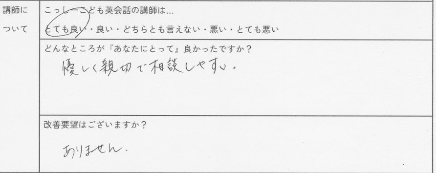 - 年齢だけでなく、個人に合わせてレッスンをしてくれる。英語で話したくたる工夫をしてくれる所。