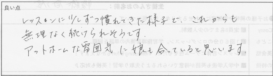 - レッスンに少しずつ慣れてきた様子で、これからも無理なく続けられそうです。アットホームな雰囲気に娘もあっていると思います。