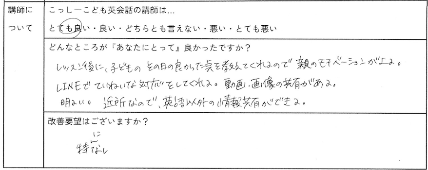 - レッスン後に、子どものその日の良かった点を教えてくれるので親のモチベーションが上がる。