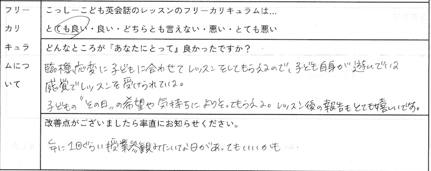 - 子どもの”その日”の希望や気持ちによりそってもらえる。レッスン後の報告もとても嬉しいです。