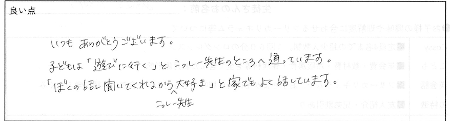 - いつもありがとうございます。子どもは「遊びに行く」とこっしー先生のところへ通っています。「ぼくの話を聞いてくれるからこっしー先生大好き」と家でもよく話しています。