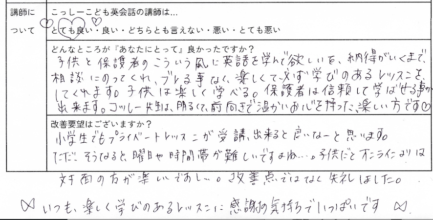 - 子供と保護者のこういう風に英語を学んでほしいを、納得いくまで、相談にのってくれ、ブレる事なく、楽しくて必ず学びのあるレッスンをしてくれます。子供は楽しく学べる。保護者は信頼して学ばせる事が出来ます。コッしー先生は、明るくて、前向きで温かいお心を持った、楽しい方です♡