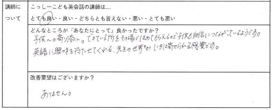 - 体験レッスン以降「次いつ先生の所に行く?」と息子の楽しみの一つになっています。ご自宅のおもちゃを使用させて頂くだけでなく、英語音楽やダンス遊び、生き物を見せてくれたり、cookingもやらせて下さる教室はここにしかないと思い、貴重な時間を過ごさせて頂けてると思います!いつもありがとうございます。今後ともよろしくお願いいたします。