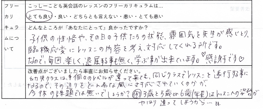 - 子供の性格や、その日の子供たちの状態、雰囲気を先生が感じとり、臨機応変にレッスン内容を考え、対応してくれる所です。なので、毎回、楽しく、退屈する事も無く、学ぶことが出来ています。♡感謝です♡