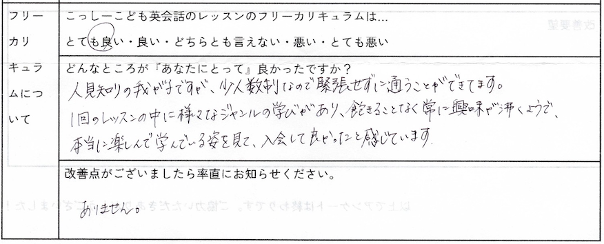 - 人見知りの我が子ですが、少人数制なので緊張せずに通うことができてます。1回のレッスンの中にさまざまなジャンルの学びがあり、飽きることなく常に興味が沸くようで、本当に楽しんでいる姿を見て、入会して良かったと感じています。